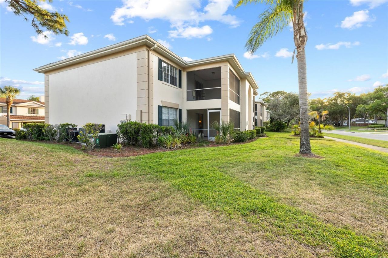 New listing in the the highly sought-after community of The Grand at Olde Carrollwood. This upstairs 2 bed, 2 bath condo is freshly painted with laminate flooring throughout. Enjoy the bright, spacious open layout with natural light and peaceful views from your large private balcony. This well maintained Condo offers a 3 YEAR OLD AC, 3 YR MICROWAVE, 2 YR DISHWASHWER , The kitchen features granite countertops, solid wood cabinetry, stainless-steel appliances, and a convenient laundry area with a full-size 1 Year old washer and older dryer. The open floor plan includes built-in shelving, wainscoting, and large living and dining spaces that make entertaining easy. Step through the sliding glass doors to your covered, oversized screened lanai. The primary suite features a walk-in closet and an updated private en-suite bath. The second bedroom has a walk in closet and full guest bath provide excellent flexibility for visitors, a home office, or a hobby room. You'll find ample storage throughout the unit, including indoor storage, a lanai storage closet, and an additional exterior storage space by the entrance. Enjoy resort-style amenities, including two pools, tennis courts, a clubhouse, fitness center, and walking paths. Valet trash service is provided right at your door, and mail is delivered directly to each building. The community is exceptionally well cared for, supported by an on-site manager, two full-time maintenance staff, and fully funded reserves for long-term financial stability. Located in the heart of Old Carrollwood, you're just a short walk from Publix, Starbucks, restaurants, banks, and shops. This fantastic location and low-maintenance lifestyle make this condo must-see.